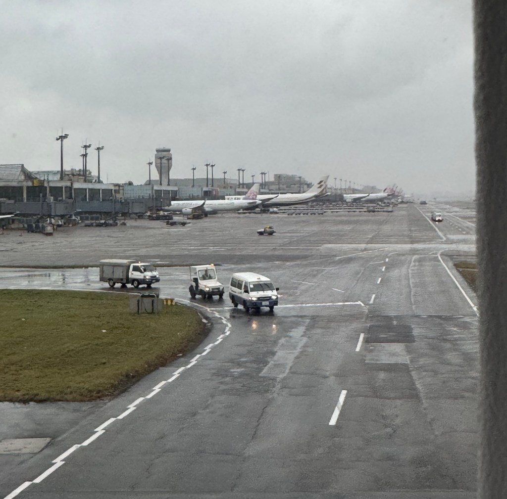 I’ve arrived in Taoyuan airport from Hong Kong International Airport, and the skies are murky and rainy.