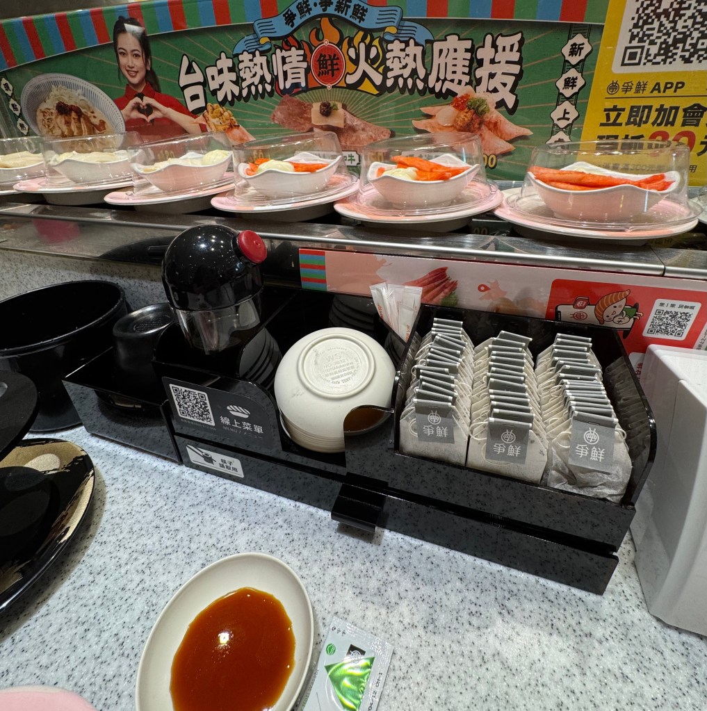 Like most conveyor sushi restaurants, there was free hot tea (green and black at this branch), free cold water, little bowls for soy sauce and wasabi, and as much pickled ginger as you can grab – the ginger tub was on the conveyor belt!
