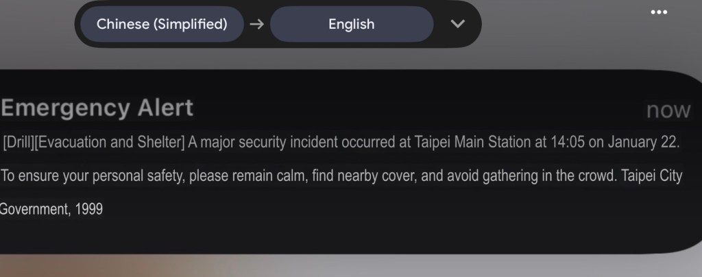 What I had really neglected to look at in the translation was the word “drill” at the start. There was no marauding attack going on nearby and no safety concern – the government were just testing out the alert system to make sure it worked! Phew. I also didn’t receive an alert in English on my phone – just Chinese – so I felt fairly lucky to be near the phone to have screenshot the warning message, to be able to translate it.