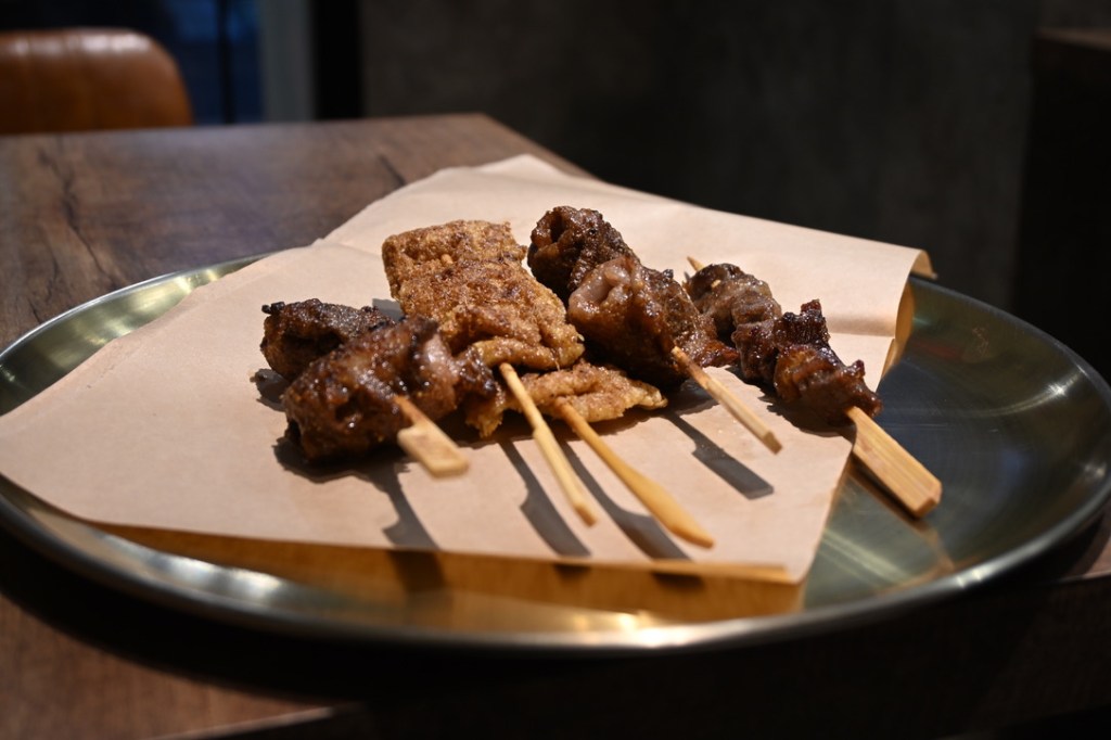 The shop will then grill your chosen skewers over hot coals, and give them back to you on a plate a few minutes afterwards! As you can see, all manner of foods are available – lots of meats, tofu and vegetables and combo skewers. There is a small seating area at this branch – others have more space to sit.