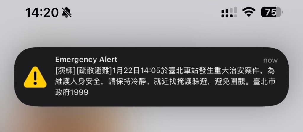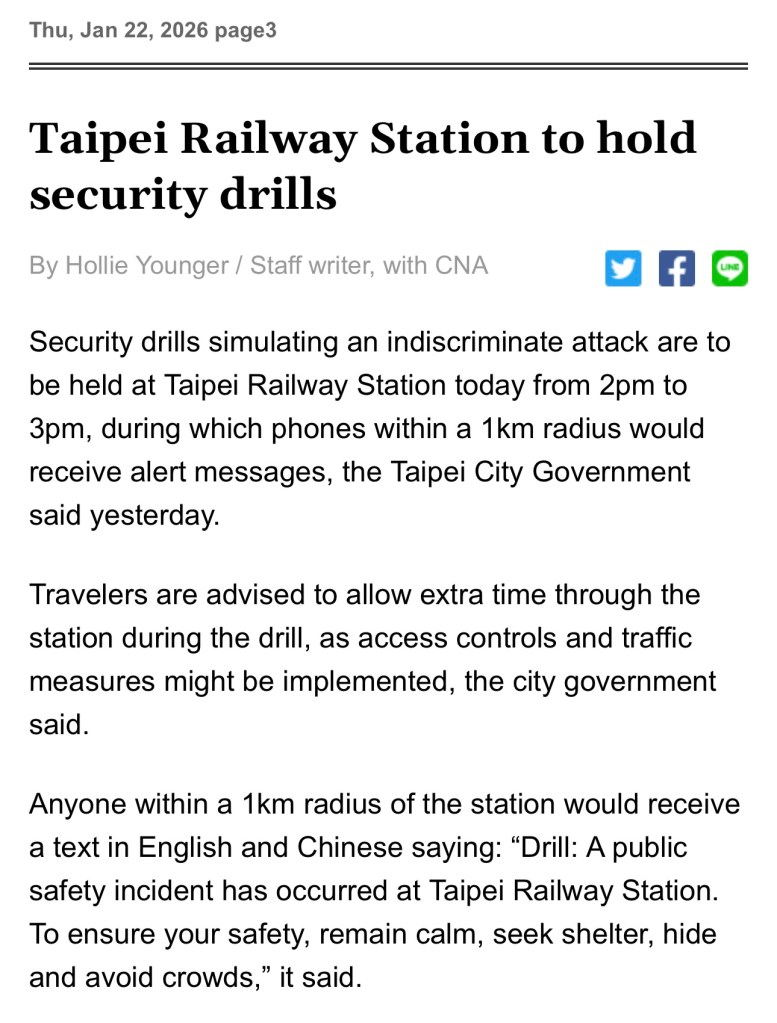 A screenshot from the Taipei Times website – the emergency alert was a drill/test.