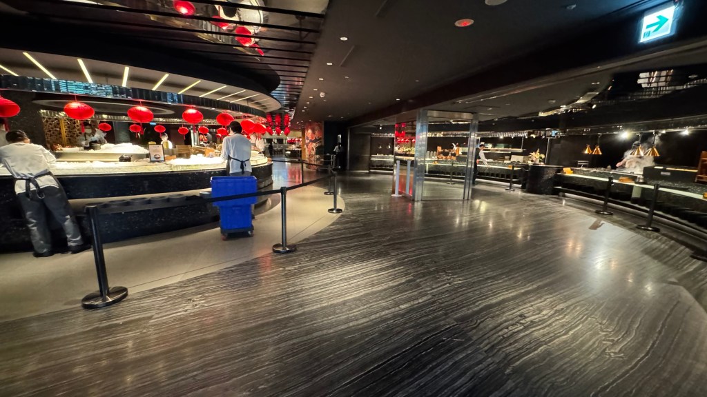 The chefs are clearing away the breakfast, but this whole buffet area stretching on until the end of the red lanterns far away in the distance is ALL the breakfast buffet space – madness!