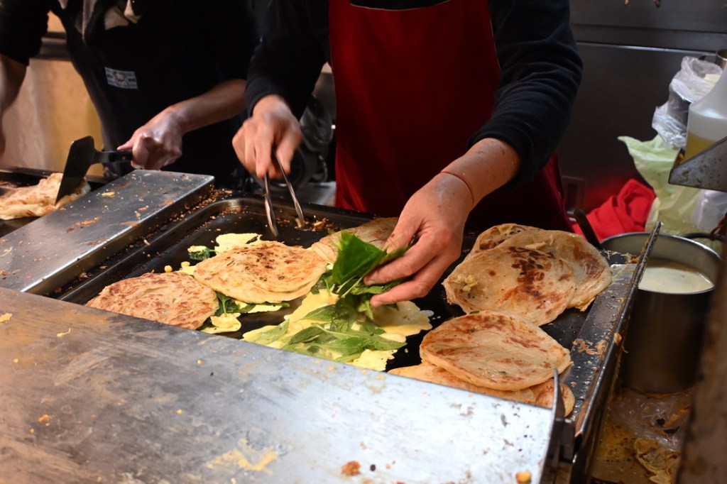 We then crossed the road to watch an amazingly fresh scallion pancake being made – Tian Jin Onion Pancake stall was for us!
