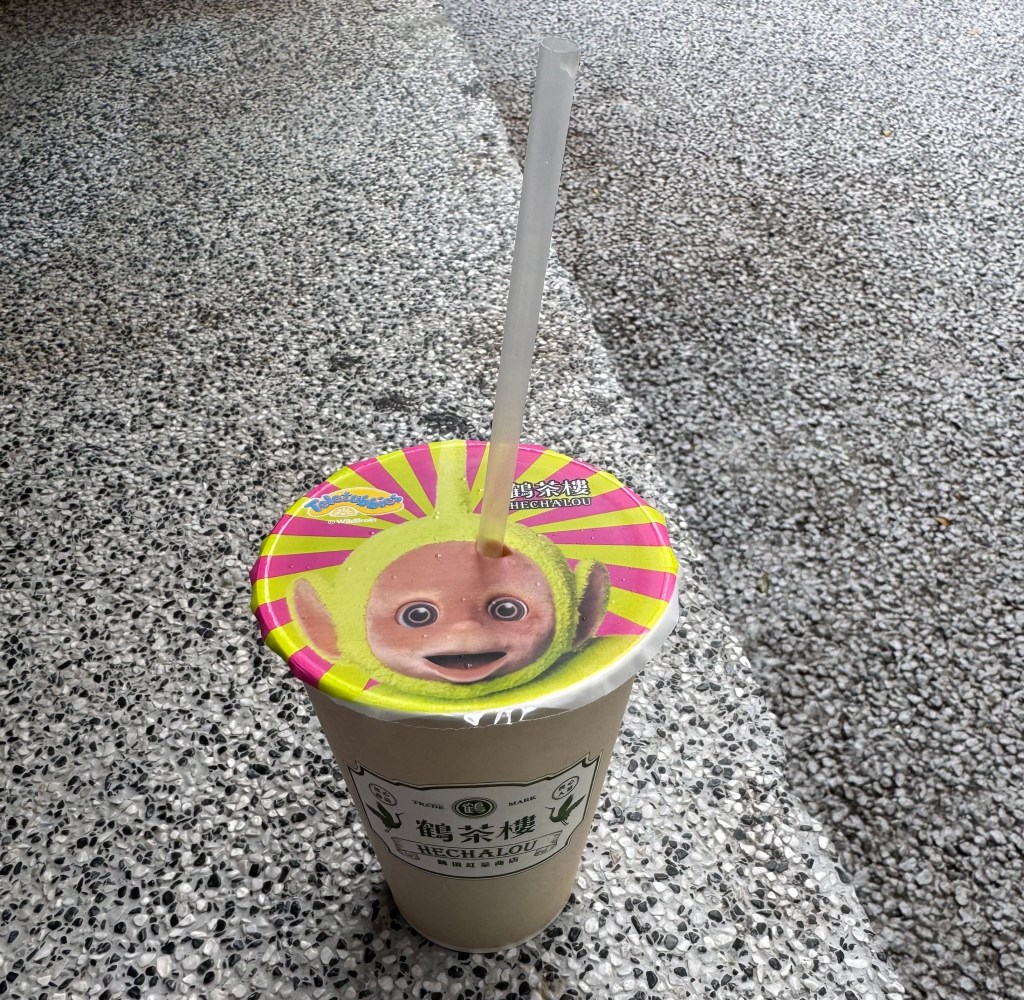 Without walking too far, I found myself at Hechalou tea and felt in the mood for a peach iced black tea – which was refreshing and scrumptious – also totally customisable in what you would like with it – I just had ice and 0% sugar and no boba or toppings. There was a Teletubbies x Hechalou collab going on at the time, which meant that I got a Dipsy cup seal and had to pop the straw into Dipsy’s face. I missed the usual aerial-spot on his face and made him look even more alien. Whoops.