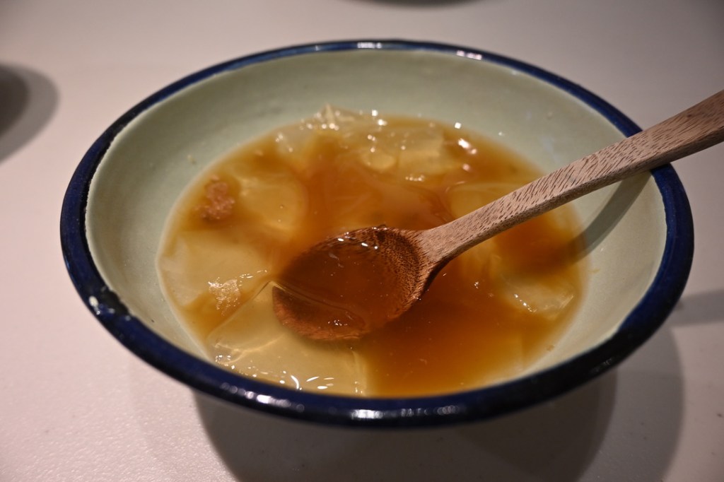 Ai-Yu Jelly? This is a yummy delicacy from this part of the world. If you take a small bag of AI Yu (Creeping Fig plant) seeds, soak it in water, and rub the bag of seeds together for a few minutes, a yellowish jelly-like substance emerges from the seeds. If you put this in the fridge for a few hours it sets – this is ai-yu jelly! It’s very cooling and refreshing and is served with ginger, lemon or fruit tea or syrup as a dessert soup – sometimes with peach tree gum too.