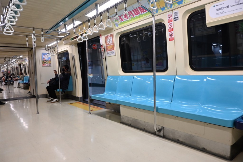 The inside of a Taipei metro train. The carriages are wide and give plenty of space for sitting and standing.
